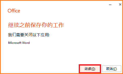 (中国語で同様のメッセージが出た場合は、同じくWordを閉じ、[继续(継続)]をクリックします)