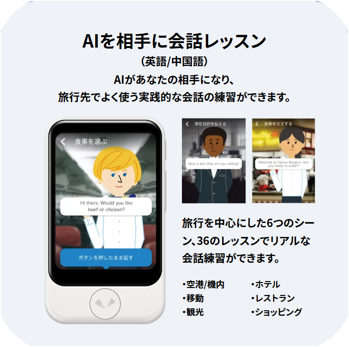 AIがあなたの相手になり、旅行先でよく使う実践的な会話の練習ができます。